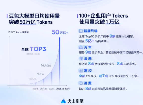 在12月18日举办的FORCE原动力大会上,火山引擎交出了一份惊人的成绩单:截至今年12月,豆包大模型日均Tokens使用量已突破50万亿,稳居中国第一、全球第三。会上,火山引擎正式发布了豆包大模型1.8与视频生成模型Seeda ...