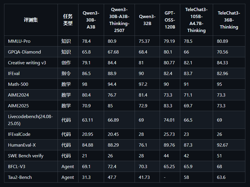 这一举措不仅验证了国产 软硬件栈 支撑 千亿级大模型 的能力,也为行业提供了 安全、可靠、可替代的技术路径,对保障 AI基础设施供应链安全 具有战略意义。 创新Thinking模式:AI推理过程可追溯TeleChat3 全系引入 Thinking(思考模式)机制——通过在对话模板中加入特定引导符号,模型可自动生成 中间推理步骤,显著提升复杂任务的 逻辑性与准确性。 在 知识问答、数学推理、内容创作、代码生成、智能体(Agent) 六大核心维度,TeleChat3 已能比肩国际主流头部模型。 开源赋能产业生态目前,TeleChat3 系列模型权重、推理代码及使用示例 已同步上线 GitHub 与 魔搭(ModelScope) 平台,支持 学术研究与商业应用。 项目地址:https://github.com/Tele-AI/TeleChat3 AiGoe观察:国产大模型进入全栈自研+能力对标新阶段TeleChat3 的发布,不仅展示了技术实力,更体现了 国产AI产业自主可控战略 的落地。当 千亿MoE模型 能在纯 国产算力 上高效训练,当 Thinking模式 逼近国际先进水平,国产大模型正从“可用”走向“好用”乃至“敢用”。 在全球 AI 竞争日益 地缘化 的背景下,中国电信以 TeleAI 为支点,正构建 安全、开放、高性能的国产AI技术栈。这一路径的成败,将直接影响中国在未来 智能时代的技术话语权。 |